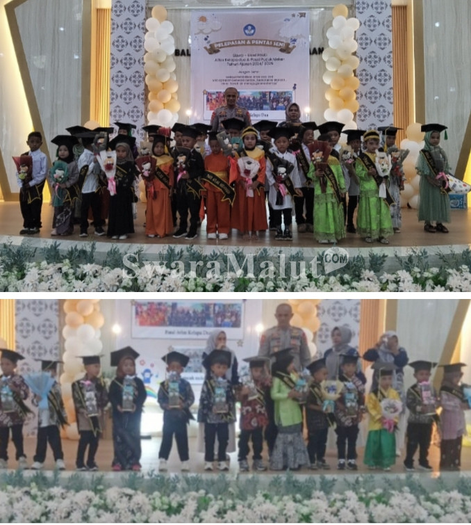 SwaraMalut.com, TERNATE – PAUD Kelapa Dua Kelurahan Rua dan Pucuk Mekar Kelurahan Jambula, Kecamatan Pulau Ternate, Kota Ternate mewisudakan sebanyak 46 Siswa – Siswi, Sabtu, (21/6/2025).